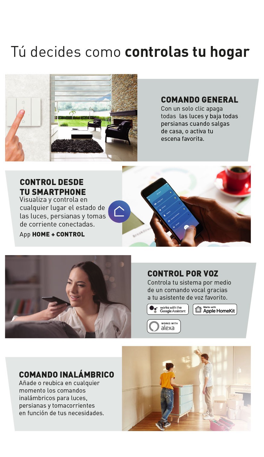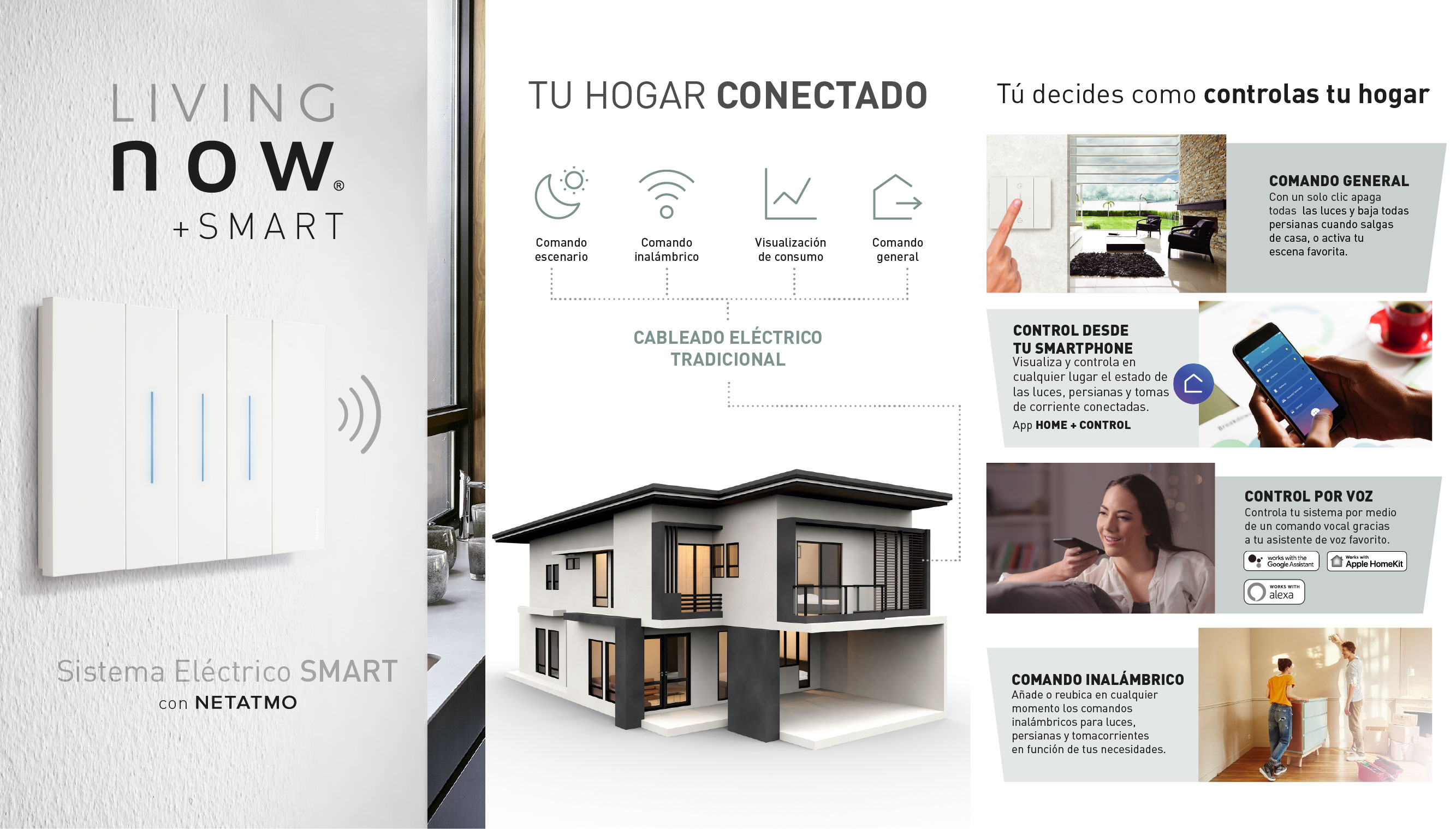 Living Now + SMART te permite controlar la iluminación, persianas, tomacorrientes y el consumo energético desde la comodidad de tu smartphone, asistentes de voz y comandos inalámbricos de living now.