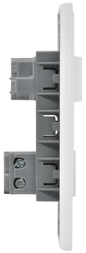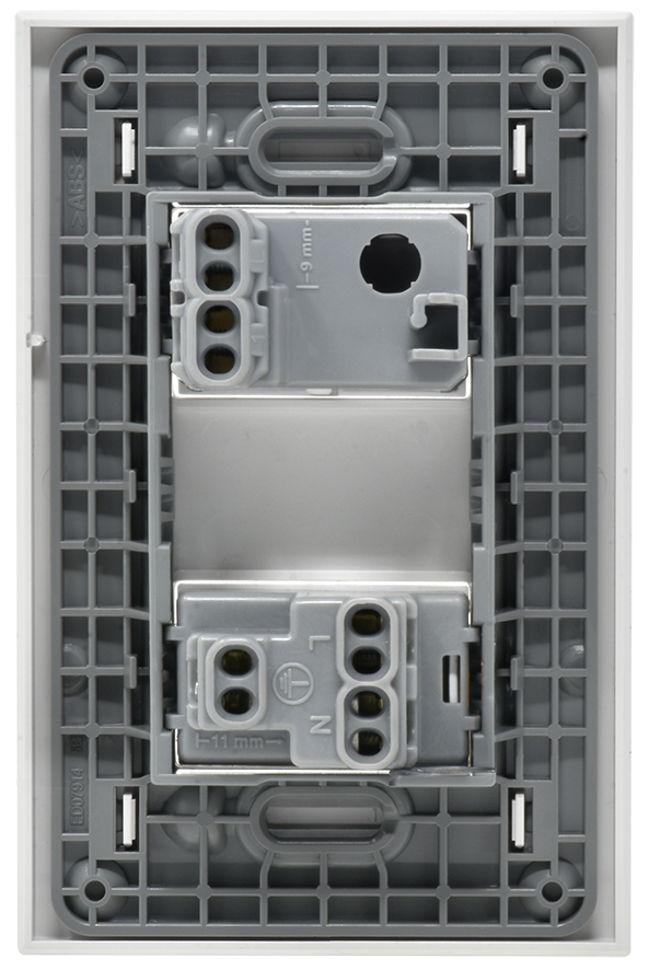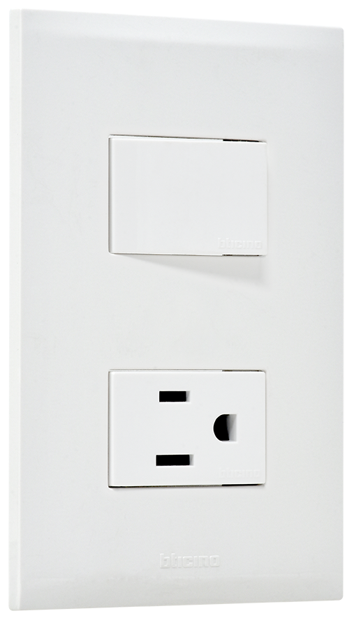 Placa blanca con 1 interruptor sencillo 15A 127V + 1 tomacorriente 2P+T 15A 127V, blanco brillante.