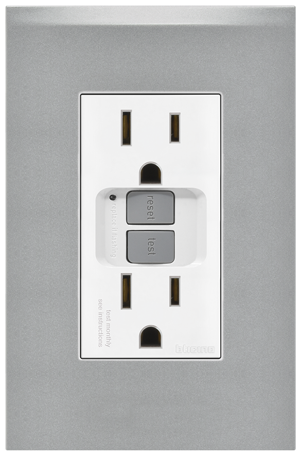 Placa tech con tomacorriente dúplex 2P+T ICFT con autoprueba y protección infantil 15A 127V, blanco brillante.